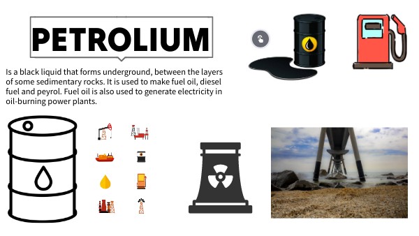 Is a black liquid that forms underground, between the layers of some sedimentary rocks. It is used to make fuel oil, diesel fuel and peyrol. Fuel oil is also used to generate electricity in oil-burning power plants.