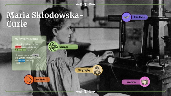 MY FAVORITE QUOTES "Nothing in life is to be feared, it is only to be understood [...]." "I won't take any salary. I'm young enough to work for myself and my children."