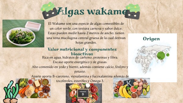 El Wakame son una especie de algas comestibles de un color verde, con textura carnosa y sabor dulce.Estas pueden medir hasta 2 metros de ancho, tienen una vena mucilagosa central gruesa de la cual derivan hojas grandes.