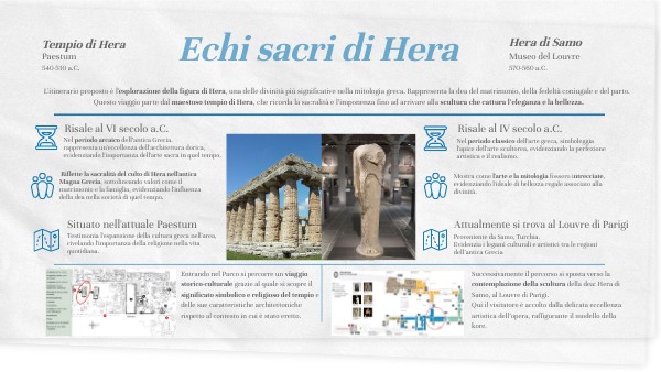 L'itinerario proposto è l'esplorazione della figura di Hera, una delle divinità più significative nella mitologia greca. Rappresenta la dea del matrimonio, della fedeltà coniugale e del parto. Questo viaggio parte dal maestoso tempio di Hera, che ricorda la sacralità e l’imponenza fino ad arrivare alla scultura che cattura l’eleganza e la bellezza.