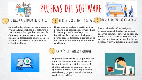 La prueba de software es un proceso que evalúa la funcionalidad del software e intenta identificar posibles errores. Su objetivo principal es asegurar que la aplicación desarrollada cumpla con los estándares y ofrezca un producto de calidad al cliente.