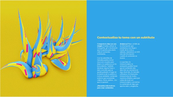 Comparte tu idea con una imagen. Puedes utilizar la fotografía, gif o ilustración que tú quieras para darle caña al contenido multimedia. Con las plantillas de Genially podrás incluir recursos visuales para dejar a tu audiencia con la boca abierta. También destacar alguna frase o dato concreto que se quede grabado a fuego en la memoria de tu público e incluso embeber contenido externo que sorprenda: vídeos, fotos, audios... ¡Lo que tú quieras! ¿Necesitas más motivos para crear contenidos