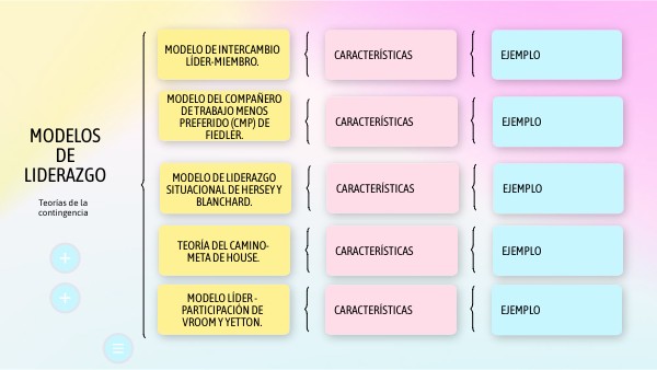 Referencias Asana, T. (2022, 7 octubre). Teoría de la contingencia de Fiedler: Un estilo de liderazgo para cada situación. Asana. https://asana.com/es/resources/fiedlers-contingency-theory Impulso. (2023, 27 julio). Cómo aplicar la teoría del Intercambio Líder-Miembro (LMX). Impulso06. https://impulso06.com/como-aplicar-la-teoria-del-intercambio-lider-miembro-lmx/ Santa-Bárbara, ES, & Rodríguez Fernández, A. (2010). 40 años de la teoría del liderazgo situacional: una revisión. Revista Latinoamericana de Psicología, 42 (1), 25-39. https://www.redalyc.org/articulo.oa?id=80515880003 Espinosa, I. (s.f.). Lección 4. Modelos de liderazgo. Universidad Virtual del Estado de Guanajuato, UVEG. https://view.genial.ly/5fd26df125a8e10d0ec9ccf6/personal-branding-liderazgo-l4-copia Willman Carvajal, S. y Velasco Arango, MI (2011). Relación en las percepciones del estilo de liderazgo del jefe inmediato con el desempeño laboral de los estudiantes en práctica de la universidad ICESI. Estudios Gerenciales, 27 (118),67-84. https://www.redalyc.org/articulo.oa?id=21218556003