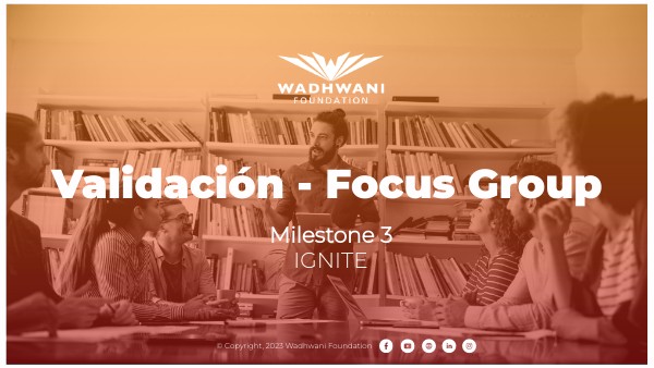 En este Milestone, consolidaremos todas las validaciones en un único ejercicio. 1. Diseña tu grupo focal, previamente te dimos ejemplos de preguntas que podrías hacer para cada una; personaliza las que necesites para las 3 rubros. Utiliza la plantilla para el diseño. 2. Invita a tus asistentes 3. Documenta tus aprendizajes. Para esto utiliza la matriz de las 4 acciones. 4. Finaliza con un resumen de las estrategias efectivas que se van a implementar.