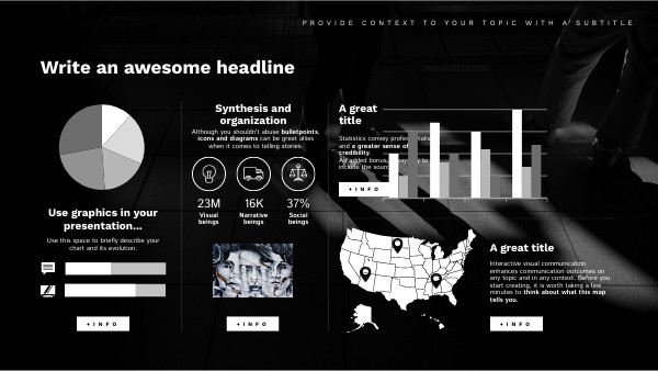 Although you shouldn't abuse bulletpoints, icons and diagrams can be great allies when it comes to telling stories.