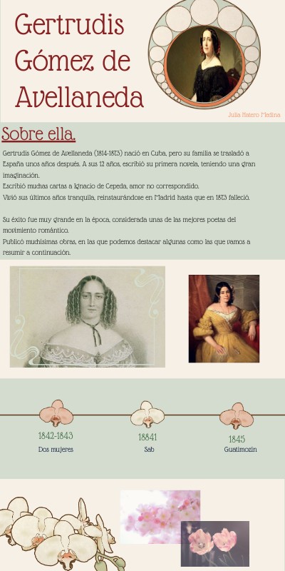 Gertrudis Gómez de Avellaneda (1814-1873) nació en Cuba, pero su familia se trasladó a España unos años después. A sus 12 años, escribió su primera novela, teniendo una gran imaginación.Escribió muchas cartas a Ignacio de Cepeda, amor no correspondido. Vivió sus últimos años tranquila, reinstaurándose en Madrid hasta que en 1873 falleció. Su éxito fue muy grande en la época, considerada unas de las mejores poetas del movimiento romántico. Publicó muchísimas obras, en las que podemos destacar algunas como las que vamos a resumir a continuación.