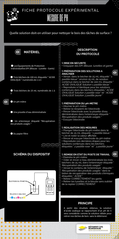 ➽ MISE EN SECURITE ‣ S'équiper des EPI (Blouse, lunettes et gants) ➽ PRÉPARATION DES SOLUTIONS A ANALYSER ‣ Verser, dans le bécher de 25 mL étiqueté " 1 pastille bleue ", environ 25 mL de solution contenue dans le bécher de 100 mL étiqueté " ACIDE OXALIQUE Solution 1 pastille bleue " ‣ Reproduire à l'dentique pour les solutions contenues dans les béchers étiquetés " ACIDE OXALIQUE Solution 2 pastille rose " et " ACIDE OXALIQUE Solution 3 pastille jaune " ➽ PRÉPARATION DU pH-METRE ‣ Allumer le pH-mètre ‣ Retirer le récipient de l'électrode ‣ Rincer l'électrode avec la pissette d'eau déminéralisée dans l'erlenmeyer étiqueté " Récupération des produits usagés " ‣ Essuyer l'électrode ➽ REALISATION DES MESURES ‣ Plonger l'électrode du pH-mètre dans le bécher de 25 mL étiqueté " 1 pastille bleue " ‣ Lire et noter la valeur affichée ‣ Rincer et essuyer l'électrode du pH-mètre ‣ Reproduire ces dernières étapes pour les solutions contenues dans les béchers étiquetés " 2 pastille rose " et " 3 pastille jaune " ➽ REMISE EN ETAT DU POSTE DE TRAVAIL ‣ Eteindre le pH-mètre ‣ Vider et rincer à l'eau déminéralisée les trois béchers de 25 mL dans l'erlenmeyer étiqueté " Récupération des produits usagés " ‣ Verser le contenu de l'erlenmeyer étiqueté " Récupération des produits usagés " dans le bidon de récupération des produits chimiques étiquetés " ACIDE " ‣ Retirer CORRECTEMENT les gants ‣ Retirer les lunettes et la blouse sans oublier de la replier CORRECTEMENT