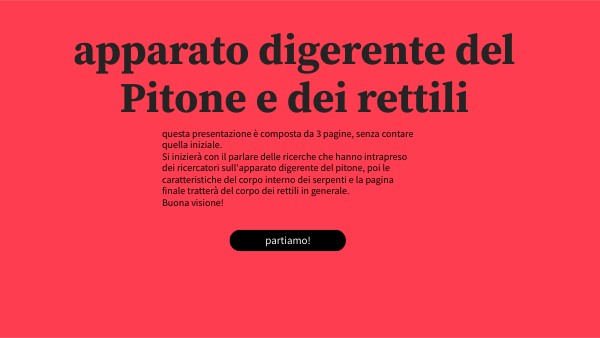 questa presentazione è composta da 3 pagine, senza contare quella iniziale.Si inizierà con il parlare delle ricerche che hanno intrapreso dei ricercatori sull'apparato digerente del pitone, poi le caratteristiche del corpo interno dei serpenti e la pagina finale tratterà del corpo dei rettili in generale. Buona visione!