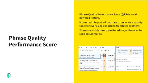 Phrase Quality Performance Score (QPS) is an AI powered feature. It uses real life post editing data to generate a quality score for every single machine translated segment. These are visible directly in the editor, or they can be seen in summaries.