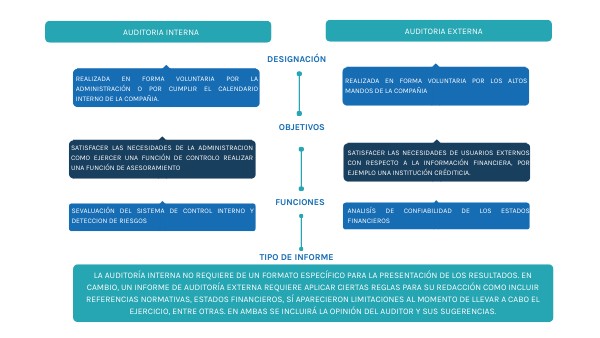 La auditoría interna no requiere de un formato específico para la presentación de los resultados. En cambio, un informe de auditoría externa requiere aplicar ciertas reglas para su redacción como incluir referencias normativas, estados financieros, sí aparecieron limitaciones al momento de llevar a cabo el ejercicio, entre otras. En ambas se incluirá la opinión del auditor y sus sugerencias.