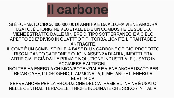 si è formato circa 300000000 di anni fa e da allora viene ancora usato , è di origine vegetale ED è UN COMBUSTIBILE SOLIDO.viene estratto dalle miniere di tipo sotterraneo e a cielo aperto ed e' diviso in quattro tipi; torba, lignite, litrantace e antracite. il coke è un combustibile a base di un carbone grigio, prodotto riscaldando carbone e olio in assenza di aria., infatti era artificiale già dalla prima rivoluzione industriale ( usato in acciaiere e altifoni). inoltre ha energia chimica/potenziale e viene anche usato per ricaricare; l' IDROGENO, L' AMMONACA, IL METANO E L' ENERGIA ELETTRICA. SERVE ANCHE PER LA PRODUZIONE DEL CATRAME ED INFINE è USATO NELLE CENTRALI TERMOELETTRICHE INQUINATE CHE SONO 7 IN ITALIA.