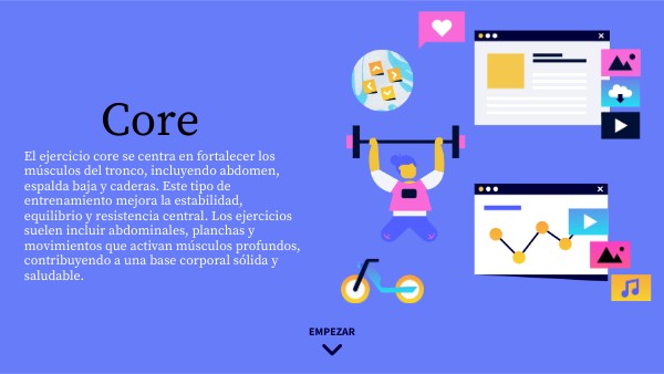 El ejercicio core se centra en fortalecer los músculos del tronco, incluyendo abdomen, espalda baja y caderas. Este tipo de entrenamiento mejora la estabilidad, equilibrio y resistencia central. Los ejercicios suelen incluir abdominales, planchas y movimientos que activan músculos profundos, contribuyendo a una base corporal sólida y saludable.