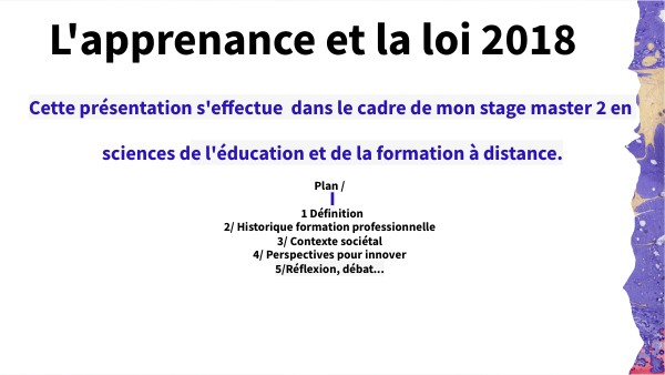 Cette présentation s'effectue dans le cadre de mon stage master 2 en sciences de l'éducation et de la formation à distance. I