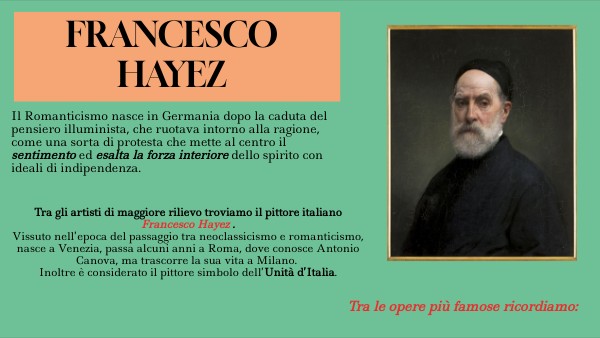 Tra gli artisti di maggiore rilievo troviamo il pittore italiano Francesco Hayez .Vissuto nell’epoca del passaggio tra neoclassicismo e romanticismo, nasce a Venezia, passa alcuni anni a Roma, dove conosce Antonio Canova, ma trascorre la sua vita a Milano. Inoltre è considerato il pittore simbolo dell’Unità d’Italia.