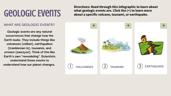 Directions: Read through this infographic to learn about what geologic events are. Click the (+) to learn more about a specific volcano, tsunami, or earthquake.