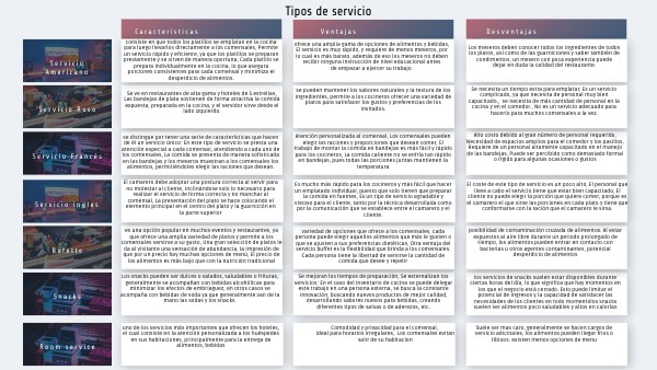 se distingue por tener una serie de características que hacen de él un servicio único: En este tipo de servicio se presta una atención especial a cada comensal, atendiendo a cada uno de los comensales, La comida se presenta de manera sofisticada en las bandejas y los meseros muestran a los comensales los alimentos, permitiéndoles elegir las raciones que desean.