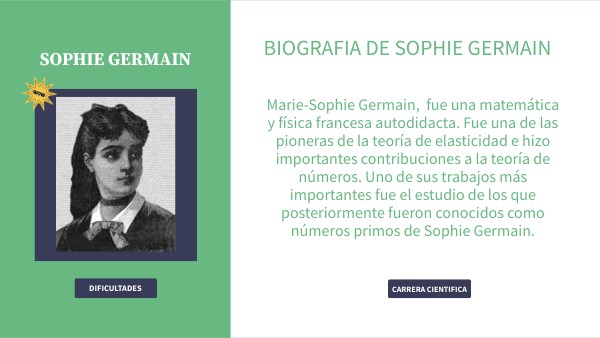 Marie-Sophie Germain, fue una matemática y física francesa autodidacta. Fue una de las pioneras de la teoría de elasticidad e hizo importantes contribuciones a la teoría de números. Uno de sus trabajos más importantes fue el estudio de los que posteriormente fueron conocidos como números primos de Sophie Germain.