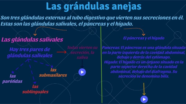 Son tres glándulas externas al tubo digestivo que vierten sus secreciones en él. Estas son las glándulas salivales, el páncreas y el hígado.