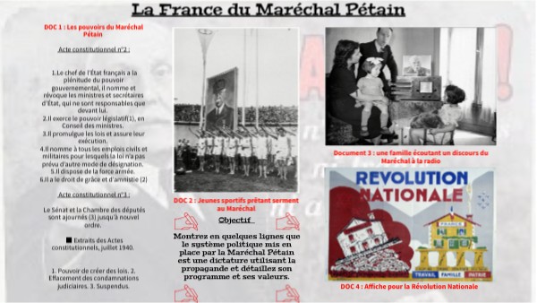 Objectif Montrez en quelques lignes que le système politique mis en place par la Maréchal Pétain est une dictature utilisant la propagande et détaillez son programme et ses valeurs.