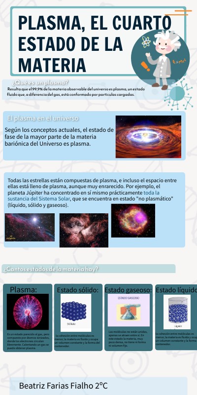 Es un estado parecido al gas, pero compuesto por átomos ionizados, donde los electrones circulan libremente. Calentando un gas se puede obtener plasma.
