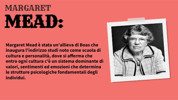 Margaret Mead è stata un'allieva di Boas che inaugura l'indirizzo studi noto come scuola di cultura e personalità, dove si afferma che entro ogni cultura c'è un sistema dominante di valori, sentimenti ed emozioni che determina le strutture psicologiche fondamentali degli individui.