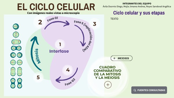Mati, & Mati. (2023, 11 julio). La mitosis es un proceso fundamental en la biología celular que permite leer más. Educaimágenes. https://educaimagenes.com/biologia/mitosis/#google_vignette Fabio augusto vanegas bovea. (2015, 13 noviembre). Reproducción celular, mitosis y meiosis [Vídeo]. YouTube. https://www.youtube.com/watch?v=2dR93baFqDI Belmonte, Á. (2019, 25 noviembre). Fases de la mitosis. unprofesor.com. https://www.unprofesor.com/ciencias-naturales/fases-de-la-mitosis-3750.html Fases de la mitosis (Artículo) | Khan Academy. (s. f.). Khan Academy. https://es.khanacademy.org/science/ap-biology/cell-communication-and-cell-cycle/cell-cycle/a/phases-of-mitosis Fundación Instituto Roche - Glosario de Genética - Anafase. (s. f.). https://www.institutoroche.es/recursos/glosario/anafase#:~:text=Anafase%20%2D%20Anaphase,una%20copia%20de%20cada%20cromosoma. Fundación Instituto Roche - Glosario de Genética - Profase. (s. f.). https://www.institutoroche.es/recursos/glosario/profase#:~:text=Profase%20%2D%20Prophase,desarrollo%20bipolar%20del%20huso%20acrom%C3%A1tico. Genotipia, R. (2021, 5 septiembre). El ciclo celular - genotipia. Genotipia. https://genotipia.com/el-ciclo-celular/ Metafase. (s. f.). Genome.gov. https://www.genome.gov/es/genetics-glossary/Metafase#:~:text=La%20metafase%20es%20una%20etapa,el%20citoplasma%20de%20la%20c%C3%A9lula. Pombal, M. M. P. M. M. Á. (s. f.). La célula. 8. Ciclo celular. Fase S. Atlas de Histología Vegetal y Animal. https://mmegias.webs.uvigo.es/5-celulas/8-s.php Editorial Grudemi. (2022, 24 agosto). Meiosis - ¿Qué es?, definición, caracterísiticas, tipos y más. Enciclopedia de Biología. https://enciclopediadebiologia.com/meiosis/