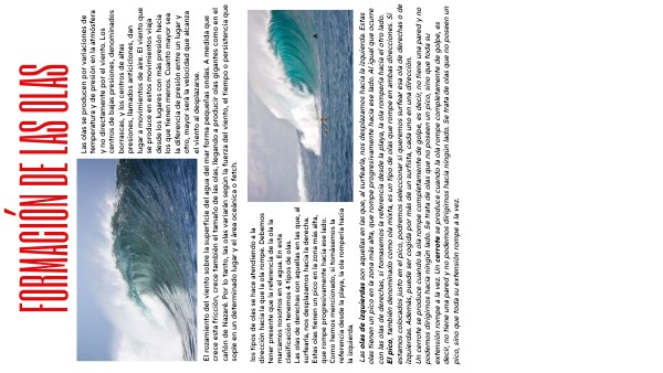 Las olas de izquierdas son aquellas en las que, al surfearla, nos desplazamos hacia la izquierda. Estas olas tienen un pico en la zona más alta, que rompe progresivamente hacia ese lado. Al igual que ocurre con las olas de derechas, si tomasemos la referencia desde la playa, la ola rompería hacia el otro lado. El pico, también denominado como ola mixta, es un tipo de olas que rompe en ambas direcciones. Si estamos colocados justo en el pico, podremos seleccionar si queremos surfear esa ola de derechas o de izquierdas. Además, puede ser cogida por más de un surfista, cada uno en una dirección. Un cerrote se produce cuando la ola rompe completamente de golpe, es decir, no tiene una pared y no podemos dirigirnos hacia ningún lado. Se trata de olas que no poseen un pico, sino que toda su extensión rompe a la vez. Un cerrote se produce cuando la ola rompe completamente de golpe, es decir, no tiene una pared y no podemos dirigirnos hacia ningún lado. Se trata de olas que no poseen un pico, sino que toda su extensión rompe a la vez.