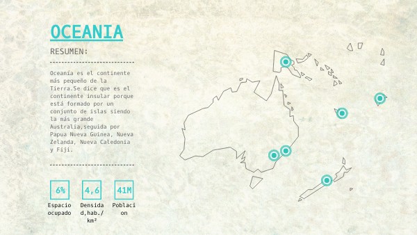 Oceanía es el continente más pequeño de la Tierra.Se dice que es el continente insular porque está formado por un conjunto de islas siendo la más grande Australia,seguida por Papua Nueva Guinea, Nueva Zelanda, Nueva Caledonia y Fiji.