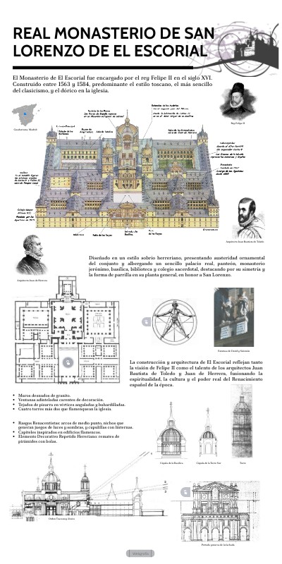 Diseñado en un estilo sobrio herreriano, presentando austeridad ornamental del conjunto y albergando un sencillo palacio real, panteón, monasterio jerónimo, basílica, biblioteca y colegio sacerdotal, destacando por su simetría y la forma de parrilla en su planta general, en honor a San Lorenzo.