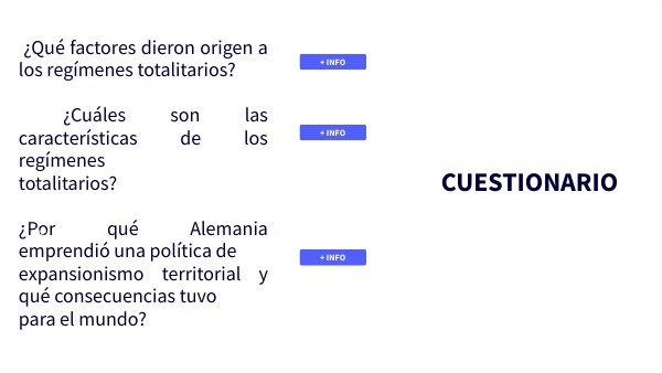 ¿Qué factores dieron origen a los regímenes totalitarios? ¿Cuáles son las características de los regímenes totalitarios? ¿Por qué Alemania emprendió una política de expansionismo territorial y qué consecuencias tuvo para el mundo?