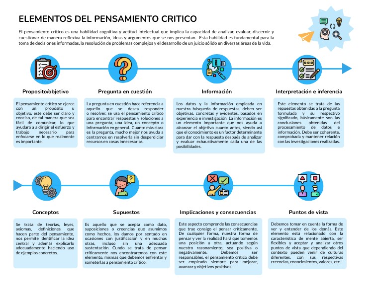 El pensamiento crítico es una habilidad cognitiva y actitud intelectual que implica la capacidad de analizar, evaluar, discernir y cuestionar de manera reflexiva la información, ideas y argumentos que se nos presentan. Esta habilidad es fundamental para la toma de decisiones informadas, la resolución de problemas complejos y el desarrollo de un juicio sólido en diversas áreas de la vida.