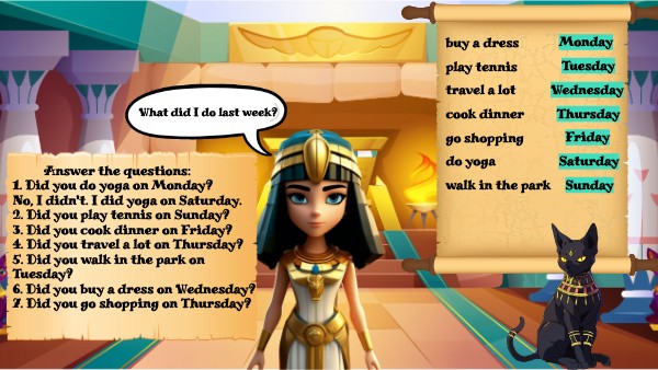 Answer the questions: 1. Did you do yoga on Monday? No, I didn't. I did yoga on Saturday. 2. Did you play tennis on Sunday? 3. Did you cook dinner on Friday? 4. Did you travel a lot on Thursday? 5. Did you walk in the park on Tuesday? 6. Did you buy a dress on Wednesday? 7. Did you go shopping on Thursday?
