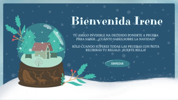 Tú amigo invisible ha decidido ponerte a prueba para saber...¿Cuánto sabes sobre la Navidad? sólo cuando superes todas las pruebas con nota recibirás tu regalo. ¡suerte bella!