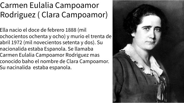 Ella nacio el doce de febrero 1888 (mil ochocientos ochenta y ocho) y murio el trenta de abril 1972 (mil novecientos setenta y dos). Su nacionalida estaba Espanola. Se llamaba Carmen Eulalia Campoamor Rodriguez mas conocido baho el nombre de Clara Campoamor. Su nacinalida estaba espanola.