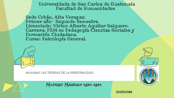 Universidada de San Carlos de Guatemala Facultad de Humanidades Sede Cobán, Alta Verapaz. Primer año- Segundo Semestre. Licenciado: Victor Alberto Aguilar Salguero. Carrera: PEM en Pedagogía Ciencias Sociales y Formación Ciudadana. Curso: Psicología General.