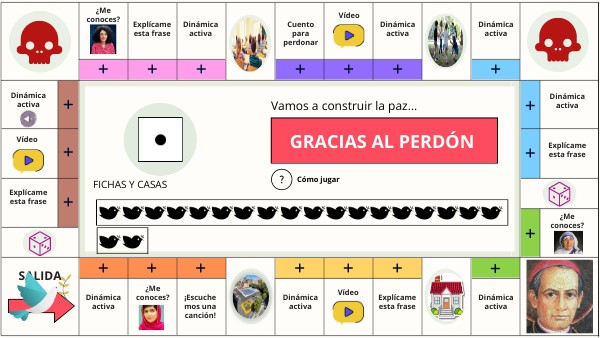 Toda la clase jugaremos juntos con el objetivo de conseguir las palomitas negras que se encuentran en el centro del tablero. Nos dividiremos en grupos de 4 personas (mayores y pequeños) Para empezar a jugar, pincha sobre el dado y mueve la paloma de la paz a la casilla correspondiente. En cada casilla tendréis todos una prueba que cumplir. Si la hacéis bien, colocaréis una de las palomas en dicha casilla. ¡Enhorabuena, estás construyendo la paz! En este juego, cooperativo, o ganamos todos... o perdemos todos... por lo tanto, tendremos que respetar nuestros turnos de juego y demostrar que el perdón nos ayudará a construir la paz. ¿Estáis preparados?