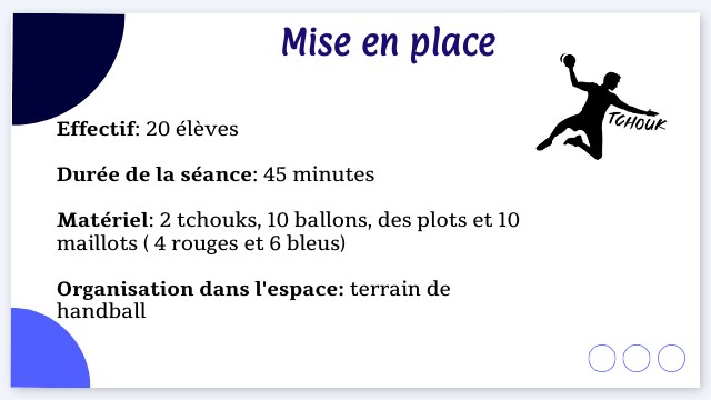 Effectif: 20 élèves Durée de la séance: 45 minutes Matériel: 2 tchouks, 10 ballons, des plots et 10 maillots ( 4 rouges et 6 bleus) Organisation dans l'espace: terrain de handball