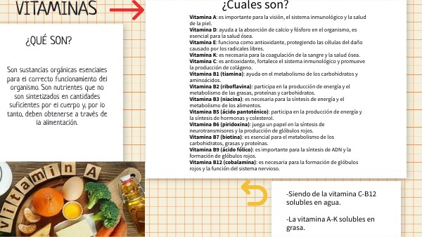 Vitamina A: es importante para la visión, el sistema inmunológico y la salud de la piel. Vitamina D: ayuda a la absorción de calcio y fósforo en el organismo, es esencial para la salud ósea. Vitamina E: funciona como antioxidante, protegiendo las células del daño causado por los radicales libres. Vitamina K: es necesaria para la coagulación de la sangre y la salud ósea. Vitamina C: es antioxidante, fortalece el sistema inmunológico y promueve la producción de colágeno. Vitamina B1 (tiamina): ayuda en el metabolismo de los carbohidratos y aminoácidos. Vitamina B2 (riboflavina): participa en la producción de energía y el metabolismo de las grasas, proteínas y carbohidratos. Vitamina B3 (niacina): es necesaria para la síntesis de energía y el metabolismo de los alimentos. Vitamina B5 (ácido pantoténico): participa en la producción de energía y la síntesis de hormonas y colesterol. Vitamina B6 (piridoxina): juega un papel en la síntesis de neurotransmisores y la producción de glóbulos rojos. Vitamina B7 (biotina): es esencial para el metabolismo de los carbohidratos, grasas y proteínas. Vitamina B9 (ácido fólico): es importante para la síntesis de ADN y la formación de glóbulos rojos. Vitamina B12 (cobalamina): es necesaria para la formación de glóbulos rojos y la función del sistema nervioso.