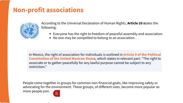 In Mexico, the right of association for individuals is outlined in Article 9 of the Political Constitution of the United Mexican States, which states in relevant part: "The right to associate or to gather peacefully for any lawful purpose cannot be subject to any restriction."