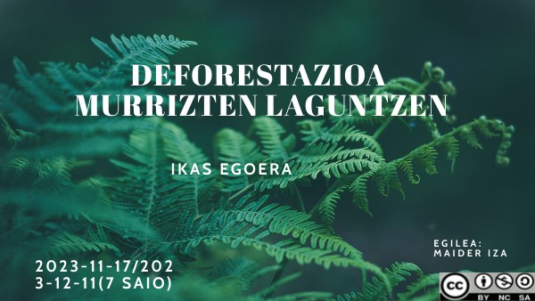 - Testuingurua. Aspaldiko argazkiei begira, gure inguruko paisaia guztiz aldatu da. - Arazoa. Deforestazioa murrizteko ekintzak praktikan jartzen al ditugu? - Xedea. Espezie anitzen habitatak libreki garatzea. - Ataza. Udaletxeari berdegune gehiago sortzeko eta babesteko proposamena egitea.