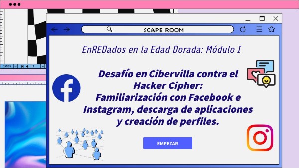 En este scape room se trabajan los contenidos de un smooc dirigidos a personas de la tercera edad, para que aprendan a utilizar la red social Facebook e Instagram.