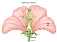 El receptáculo o eje floral es la parte que le sigue al pedúnculo, ya que es su ensanchamiento y donde se asientan las hojas de la flor y el resto de sus partes.