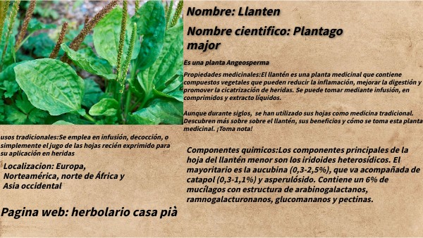 Propiedades medicinales:El llantén es una planta medicinal que contiene compuestos vegetales que pueden reducir la inflamación, mejorar la digestión y promover la cicatrización de heridas. Se puede tomar mediante infusión, en comprimidos y extracto líquidos.Aunque durante siglos, se han utilizado sus hojas como medicina tradicional. Descubren más sobre sobre el llantén, sus beneficios y cómo se toma esta planta medicinal. ¡Toma nota!