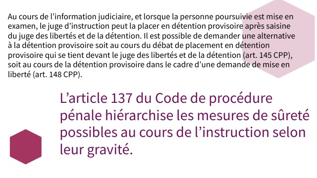 Au cours de l’information judiciaire, et lorsque la personne poursuivie est mise en examen, le juge d’instruction peut la placer en détention provisoire après saisine du juge des libertés et de la détention. Il est possible de demander une alternative à la détention provisoire soit au cours du débat de placement en détention provisoire qui se tient devant le juge des libertés et de la détention (art. 145 CPP), soit au cours de la détention provisoire dans le cadre d’une demande de mise en liberté (art. 148 CPP).