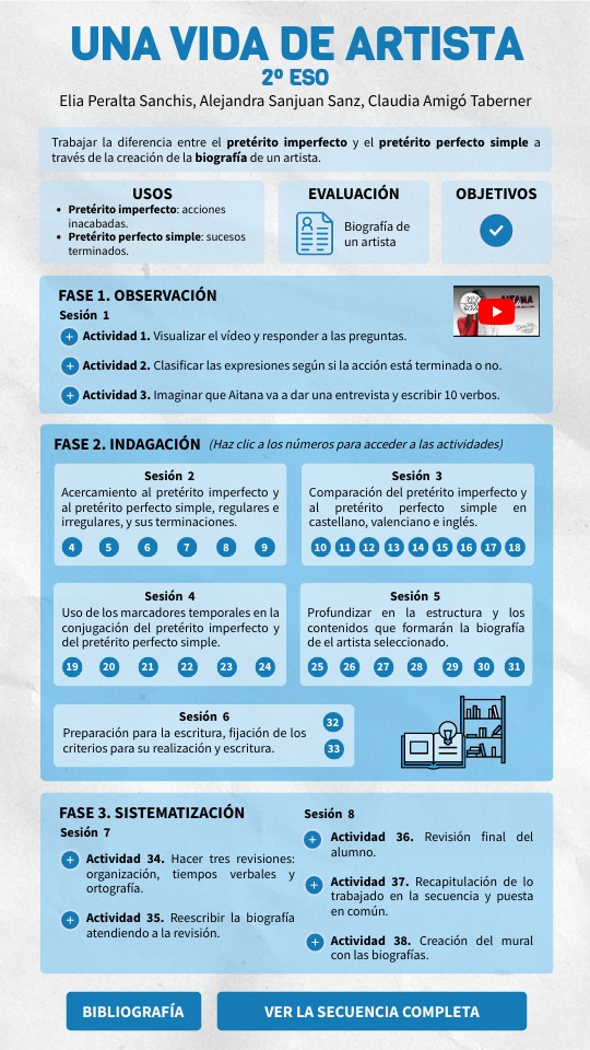 Asale, R. Y. (s. f.). Pretérito imperfecto de indicativo | glosario de términos gramaticales. «Glosario de términos gramaticales». https://www.rae.es/gtg/pret%C3%A9rito-imperfecto-de-indicativo Asale, R. Y. (s. f.-b). Pretérito perfecto simple | glosario de términos gramaticales. «Glosario de términos gramaticales». https://www.rae.es/gtg/pret%C3%A9rito-perfecto-simple Camps, A. (2006). Secuencias didácticas para aprender gramática (SDG). En A.Camps y F. Zayas (Coords.), Secuencias didácticas para aprender gramática (pp.31-37). Graó. [disponible en línea en Trobes] Generalitat de Catalunya. (2019, marzo 1). «cantí» o «vaig cantar»? / «sentí» o «va sentir»? / Usos del passat simple i el passat perifràstic. Optimot. Consultes lingüístiques. Recuperado 12 de diciembre de 2023, de https://aplicacions.llengua.gencat.cat/llc/AppJava/index.html;jsessionid=D07212B31E957AEFE09924DC9B93060A?input_cercar=passat+simple+i+passat+perifr%E0stic&action=Principal&method=detall_completa&numPagina=1&idHit=12751&database=FITXES_PUB&tipusFont=Fitxes%20de%20l%27Optimot&idFont=12751&titol=%27cant%ED%27%20o%20%27vaig%20cantar%27?%20/%20%27sent%ED%27%20o%20%27va%20sentir%27?%20/%20Usos%20del%20passat%20simple%20i%20el%20passat%20perifr%E0stic&numeroResultat=1&clickLink=detall&tipusCerca=cerca.traduir Glosario de términos gramaticales (RAE-ASALE, 2020). Gonzalo, C. R. (2011). El saber gramtical sobre los tiempos del pasado en alumnos de 4o de secundaria obligatoria. Las relaciones entre conceptualización y uso lingüístico en la enseñanza de la gramática. TDX (Tesis Doctorals en Xarxa). http://roderic.uv.es/handle/10550/42649 Gonzalo, C. R. (2012). Un espai de reflexió i recerca gramatical al voltant dels temps verbals del passat a quart d’ESO. Articles: Revista de didàctica de la llengua i de la literatura, 57, 69-85. http://redined.mecd.gob.es/xmlui/handle/11162/105003 Nueva gramática básica de la lengua española (RAE-ASALE, 2011). Proyecto Egramint. (2023a, abril 3). Cómo estaba y cómo estoy: Carta al maestro de primaria. Egramint. Recuperado 12 de diciembre de 2023, de https://sites.google.com/view/sdg-egramint/sdg-secundaria/c%C3%B3mo-estaba-y-c%C3%B3mo-estoy-1%C2%BA-eso Proyecto Egramint. (2023b, julio 28). Com expressem l’obligació?: Normes, regles, instruccions. . . Egramint. Recuperado 12 de diciembre de 2023, de https://sites.google.com/view/sdg-egramint/sdg-secundaria/com-expressem-lobligaci%C3%B3-3r-eso?authuser=0 Rae. (s. f.). El pretérito imperfecto (cantaba) (III). Relevancia del modo de acción. La oposición canté / cantaba | Nueva gramática de la lengua española. «Nueva gramática de la lengua española». https://www.rae.es/gram%C3%A1tica/sintaxis/el-pret%C3%A9rito-imperfecto-cantaba-iii-relevancia-del-modo-de-acci%C3%B3n-la-oposici%C3%B3n-cant%C3%A9--cantaba?resaltar=imperfecto+narrativo#23.12p Rodríguez Gonzalo, C. (2012). Un espai de reflexió i recerca gramatical al voltant dels temps verbals del passat a 4t d’ESO. Articles de Didàctica de la llengua i la Literatura, 57, 69-85. Rodríguez Gonzalo, C. y Zayas, F. (2017). La relación entre conocimientos gramaticales y el aprendizaje de prácticas discursivas: El adjetivo como ejemplo. Caplletra, 63, 245-277. DOI: https://doi.org/10.7203/caplletra.63.10401. Rodríguez-Gonzalo, C. (2022). Situaciones de aprendizaje para la reflexión interlingüística. Textos de Didáctica de la Lengua y la Literatura, 97, 41-46.