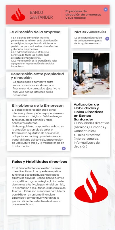 En el Banco Santander existen diversos roles directivos clave que desempeñan funciones específicas, las habilidades directivas clave del Banco incluyen, entre otras, el liderazgo estratégico, la toma de decisiones efectiva, la gestión del cambio, la orientación a resultados, el desarrollo de talento.... Estas son esenciales para liderar con éxito en un entorno financiero dinámico y competitivo y garantiza la gestión eficiente y efectiva de diversas áreas en el banco.