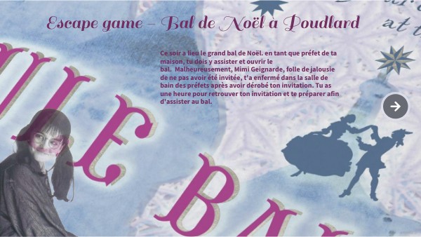 Ce soir a lieu le grand bal de Noël. en tant que préfet de ta maison, tu dois y assister et ouvrir le bal. Malheureusement, Mimi Geignarde, folle de jalousie de ne pas avoir été invitée, t'a enfermé dans la salle de bain des préfets après avoir dérobé ton invitation. Tu as une heure pour retrouver ton invitation et te préparer afin d'assister au bal.