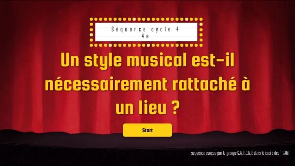 Cet exemple de séquence est adaptable, modifiable,etc... en fonction des objectifs pédagogiques de chacun. Le projet musical peut aussi être modifié, par exemple en utilisant un morceau de sicre de Francis Cabrel ou tout autre chant, interprété dans différents lieux.