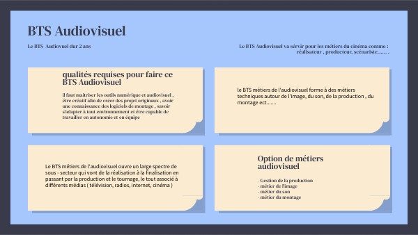 Le BTS métiers de l'audiovisuel ouvre un large spectre de sous - secteur qui vont de la réalisation à la finalisation en passant par la production et le tournage, le tout associé à différents médias ( télévision, radios, internet, cinéma )