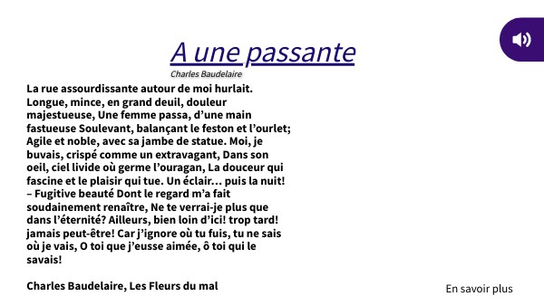 La rue assourdissante autour de moi hurlait. Longue, mince, en grand deuil, douleur majestueuse, Une femme passa, d’une main fastueuse Soulevant, balançant le feston et l’ourlet; Agile et noble, avec sa jambe de statue. Moi, je buvais, crispé comme un extravagant, Dans son oeil, ciel livide où germe l’ouragan, La douceur qui fascine et le plaisir qui tue. Un éclair… puis la nuit! – Fugitive beauté Dont le regard m’a fait soudainement renaître, Ne te verrai-je plus que dans l’éternité? Ailleurs, bien loin d’ici! trop tard! jamais peut-être! Car j’ignore où tu fuis, tu ne sais où je vais, O toi que j’eusse aimée, ô toi qui le savais! Charles Baudelaire, Les Fleurs du mal